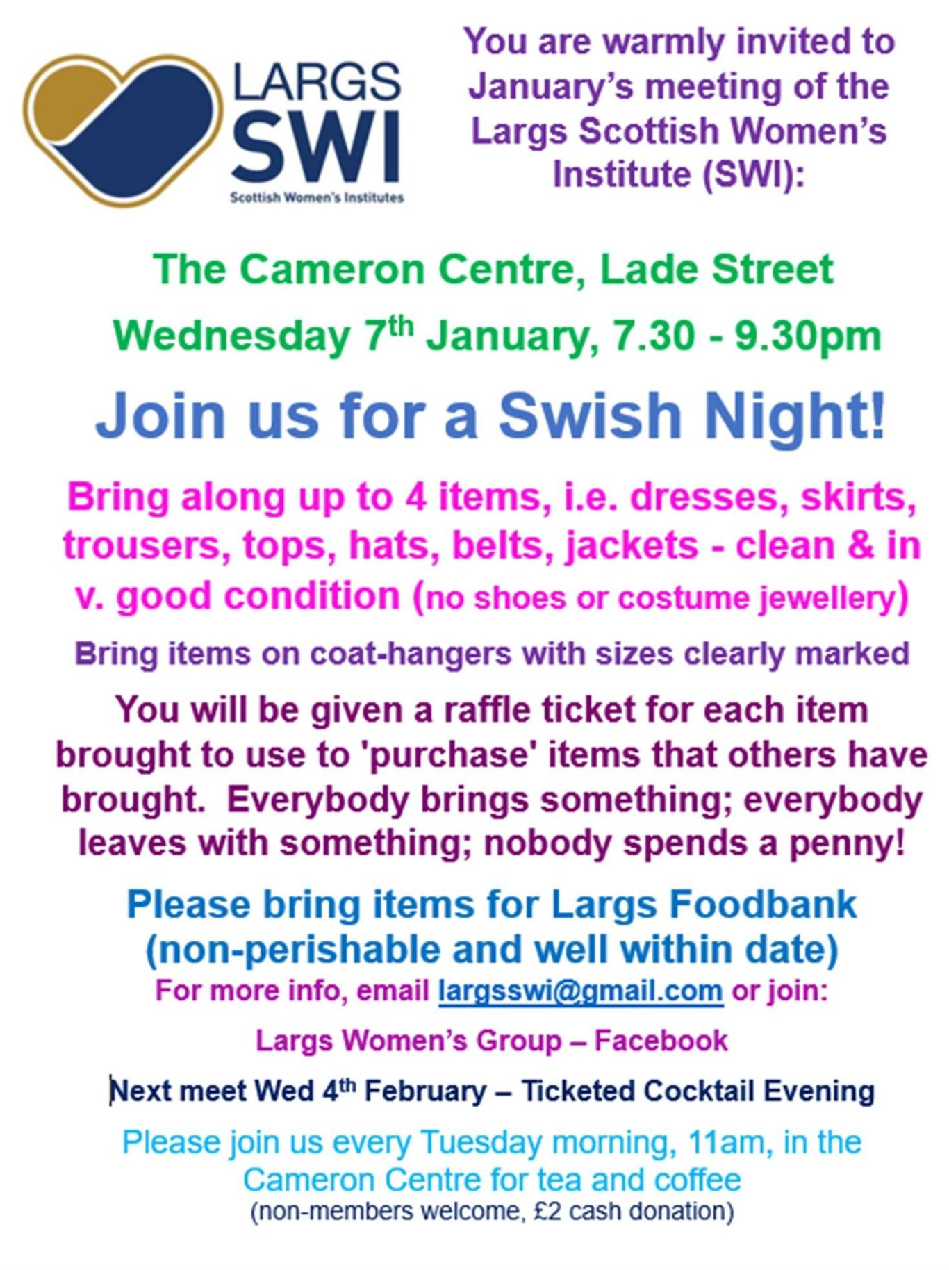 We are now looking forward to January's Swish night. If this is new to you, you bring along some clothing items or accessories (bags, belts, hats - no shoes or jewellery) that you no longer want that are in clean and good condition. For each item you will receive a token (up to a maximum of four) that you can then use to 'buy' a perfect piece for your wardrobe that has been brought in by someone else! This is slow fashion at it's best! We are also supporting Largs Foodbank and ask that you bring in a donation of food (non-perishable & with a good date) that will help families in Largs.